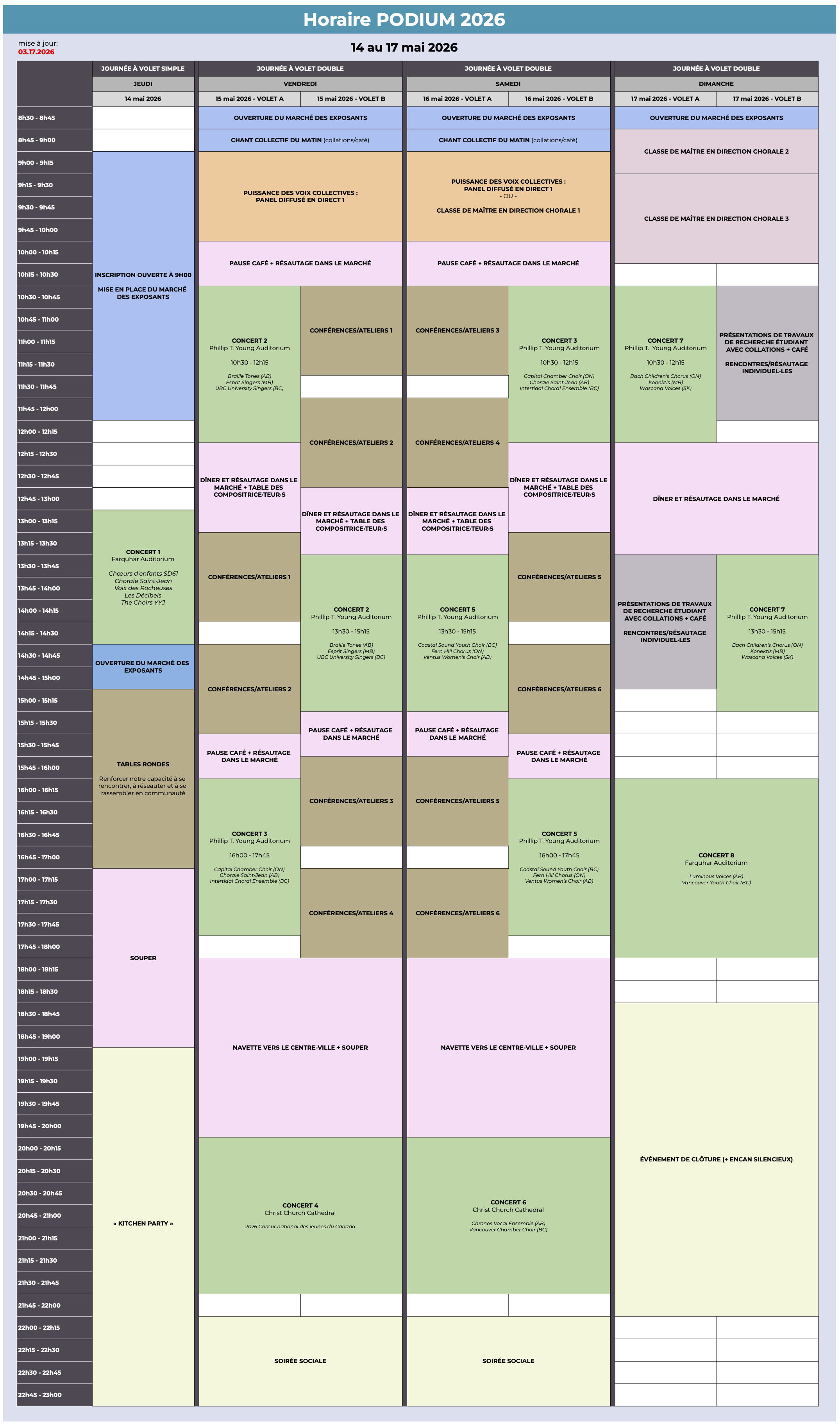 L'horaire est sujet à changement. Dernière mise à jour : 17 mars 2026